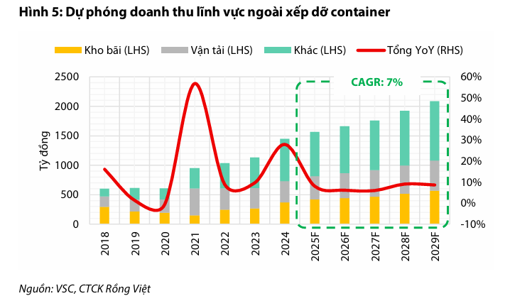Hoạt động ngoài xếp dỡ (kho bãi, vận tải đường bộ, forwarder) được kỳ vọng duy trì vai trò bổ trợ tăng trưởng, với doanh thu dự kiến đạt CAGR 6%-8%.
