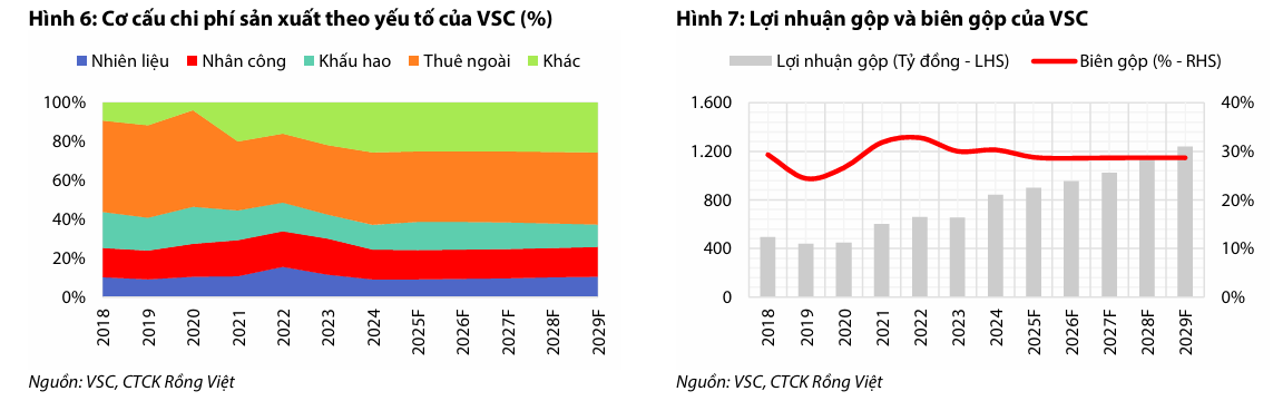 Biên lợi nhuận gộp của VSC được dự báo duy trì quanh mức 28% trong giai đoạn 2025-2029, thấp hơn trước do chi phí khấu hao tăng mạnh từ việc hợp nhất cảng NHĐV. Tuy nhiên, biên ròng cốt lõi được kỳ vọng cải thiện nhờ chi phí lãi vay giảm và hiệu quả khai thác NHĐV gia tăng, duy trì ở mức 2.1%–2.6%.