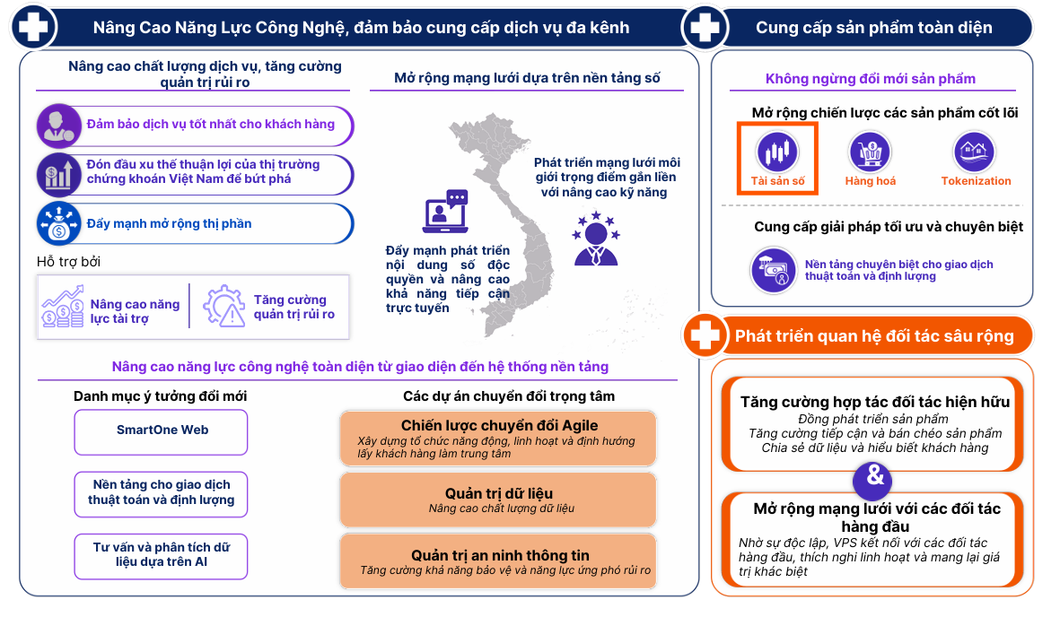 - Chiến lược tăng trưởng tập trung vào công nghệ và tài sản số, VPS đầu tư mạnh vào hệ thống giao dịch KRX, nội dung số độc quyền và chuẩn bị trở thành nhà môi giới sản phẩm tài sản số (token hóa bất động sản…).