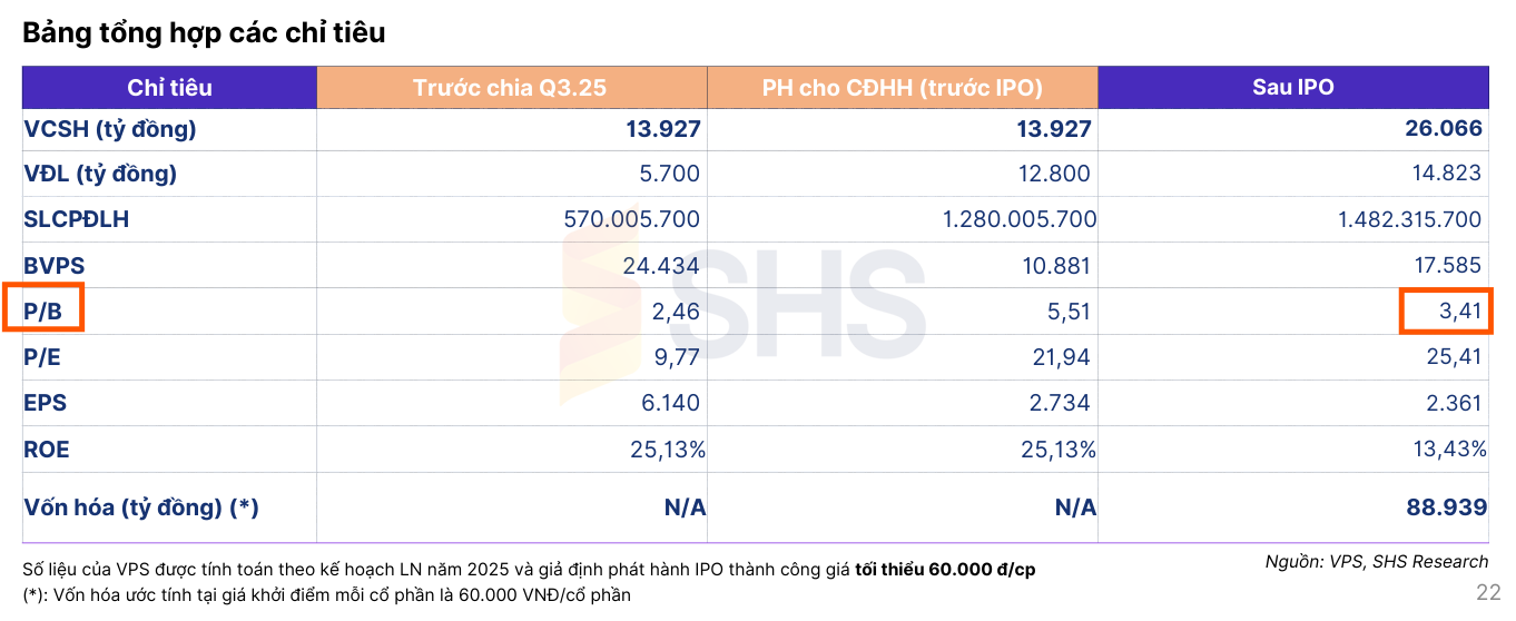 Trong phương án IPO, VPS dự kiến chào bán với mức giá tối thiểu là 60,000 đồng mỗi cổ phiếu. SHS nhận định mức giá này là hợp lý, tương xứng với tiềm năng tăng trưởng của một doanh nghiệp đang chiếm lĩnh thị phần và có chiến lược rõ ràng nhằm đa dạng hóa sản phẩm, đón đầu xu hướng tài sản số, từ đó duy trì tốc độ tăng trưởng cao và vượt trội so với mức tăng trưởng chung của thị trường chứng khoán Việt Nam.