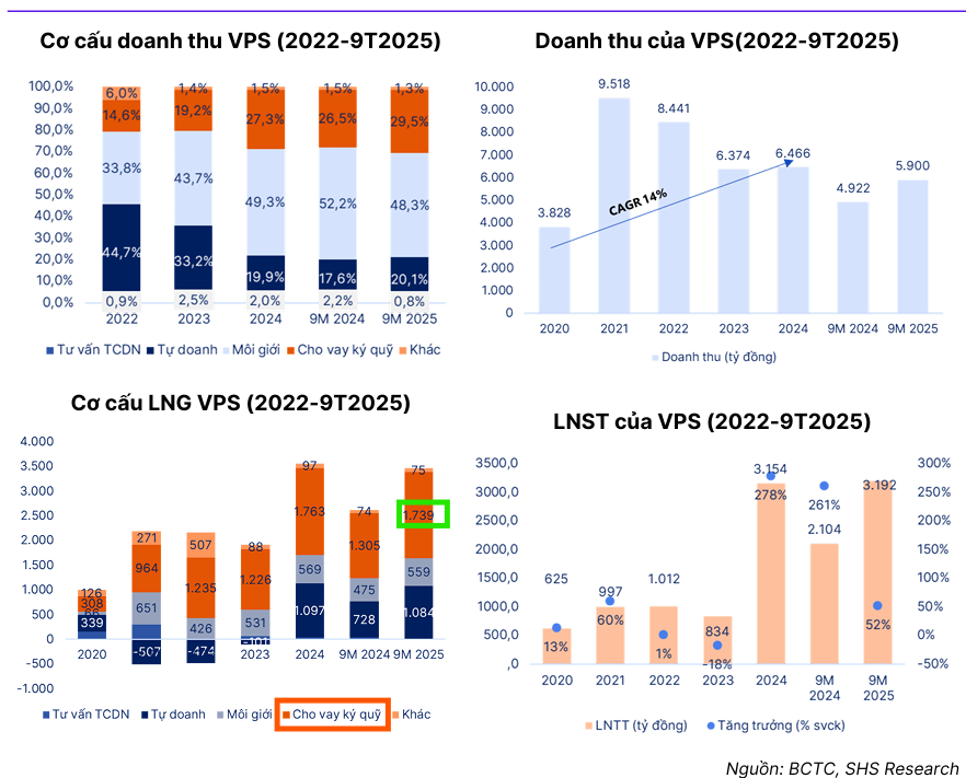 Luận điểm đầu tư cốt lõi mà SHS nhấn mạnh chính là sự vượt trội của VPS trong lĩnh vực môi giới chứng khoán và cho vay ký quỹ. Với kinh nghiệm 19 năm hình thành và phát triển, VPS đã củng cố vững chắc vị thế là công ty chứng khoán nắm giữ thị phần môi giới cổ phiếu lớn nhất Việt Nam. Sự thống trị này không chỉ phản ánh năng lực cạnh tranh và hệ thống công nghệ vượt trội mà còn thể hiện khả năng thu hút và giữ chân khối lượng khách hàng khổng lồ, là nền tảng vững chắc cho sự tăng trưởng của các mảng kinh doanh khác, đặc biệt là hoạt động cho vay ký quỹ.