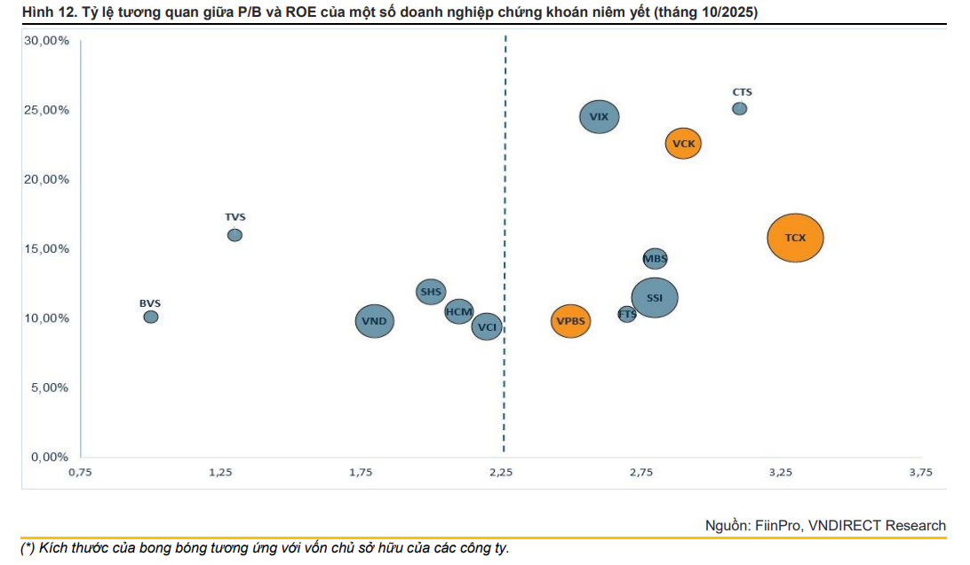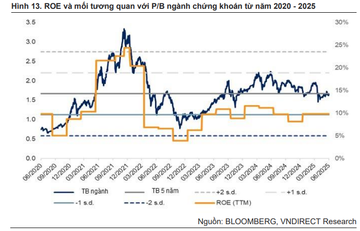 VNDirect nhận định mức định giá cao này là phù hợp vì thị trường chứng khoán Việt Nam đang ở giai đoạn phát triển vượt bậc nhờ thông tin nâng hạng FTSE Russell và kỳ vọng MSCI. Điều này tạo môi trường lý tưởng để các công ty chứng khoán gia tăng lợi nhuận bền vững từ các mảng cốt lõi, hứa hẹn ROE của toàn ngành sẽ hồi phục.