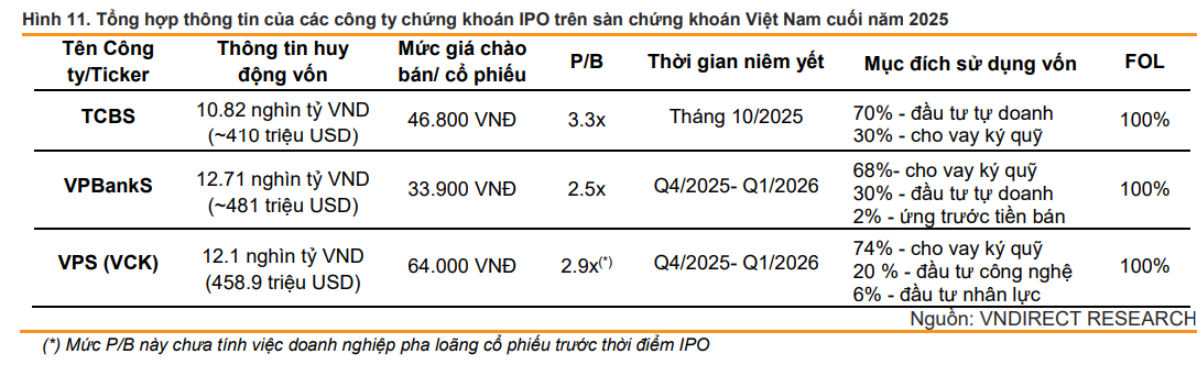 IPO tạo động lực tái định giá toàn ngành, với mức định giá P/B cao (2.8x–3.5x) trở thành chuẩn mới; VNDirect dự báo P/B trung bình ngành sẽ tăng từ 2.2x lên 2.5x, tập trung vào các công ty có vốn lớn, ROE cao và chiến lược số hóa mạnh.
