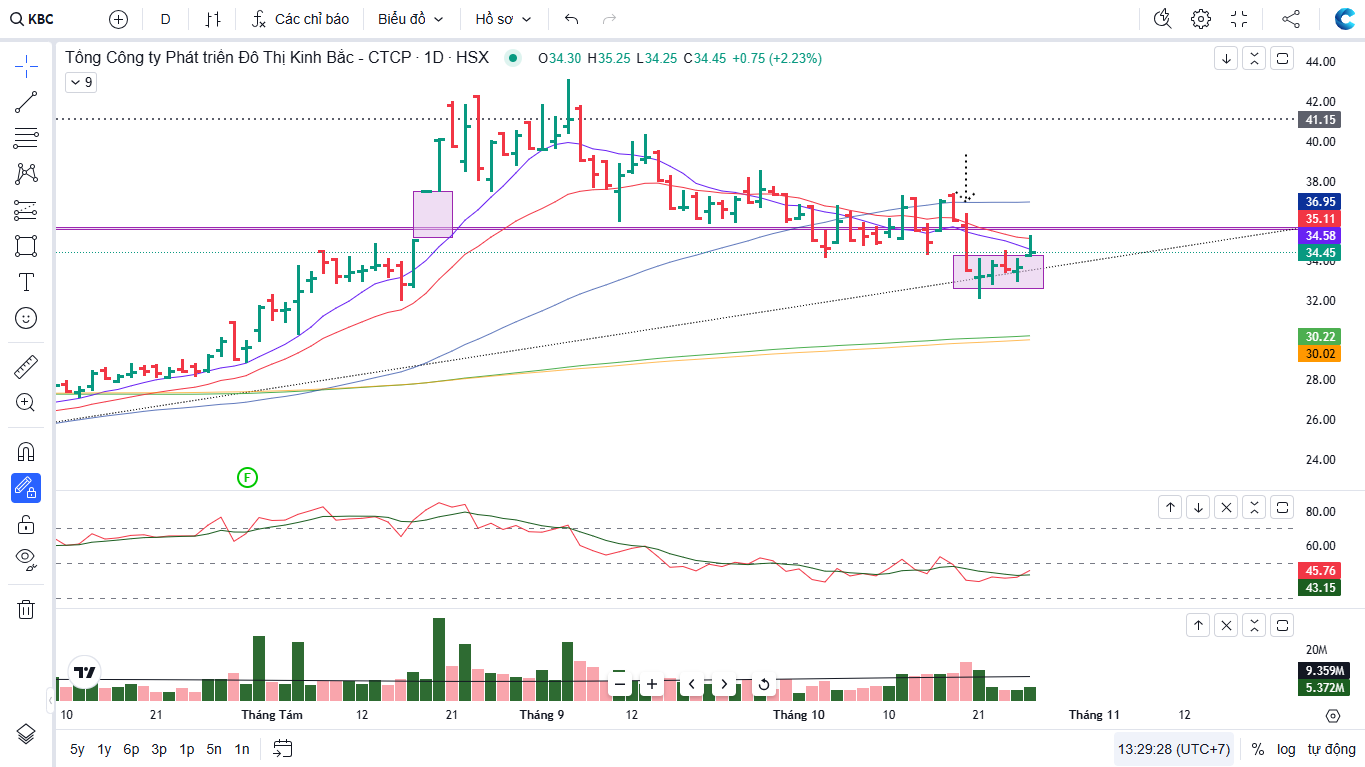 Trên đồ thị kỹ thuật, KBC có RS=70.5, mức khá tốt trên thị trường. Sau phiên giảm gần 100 điểm của thị trường, KBC đập gãy MA50 ngày với vol lớn (cùng trạng thái với phần lớn cổ phiếu trên thị trường), đây cũng là vùng hỗ trợ cứng của cổ phiếu tại giá 35,500 đồng. Hiện tại KBC đang có nhịp hồi kỹ thuật tại hỗ trợ trendline, nếu KBC có thể giữ và tích lũy tốt quanh vùng hỗ trợ hiện tại, đây có thể là vùng nhà đầu tư có thể cân nhắc quan sát, đánh take profit quanh giá 42,200 đồng, tuy nhiên, nếu KBC không giữ được vùng hỗ trợ hiện tại, khả năng KBC còn phải điều chỉnh sâu hơn, tức là tìm hỗ trợ quanh MA150 ngày và Ma200 ngày.