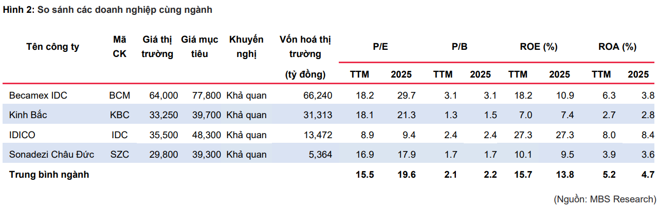 MBS định giá cổ phiếu KBC ở mức 39,700 đồng/cổ phiếu, cao hơn 19.4% so với giá thị trường ngày 22/10/2025 là 33,250 đồng/cổ phiếu. Ở mức giá hiện tại, vốn hóa thị trường của KBC đạt khoảng 37,100 tỷ đồng, tương ứng P/E dự phóng năm 2025 là 21.3 lần và P/B 1.5 lần, thấp hơn Becamex IDC (BCM) và tương đương Sonadezi Châu Đức (SZC). Tổng giá trị tài sản định giá đạt 39,504 tỷ đồng, trong đó mảng khu công nghiệp chiếm 15,135 tỷ đồng và mảng khu đô thị chiếm 22,338 tỷ đồng, sau khi trừ nợ vay và lợi ích cổ đông thiểu số, giá trị hợp lý còn lại tương ứng với mức định giá hiện tại.
