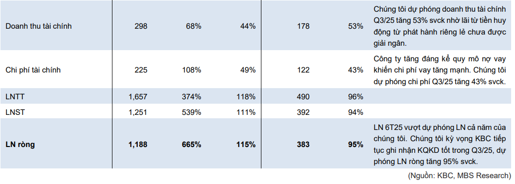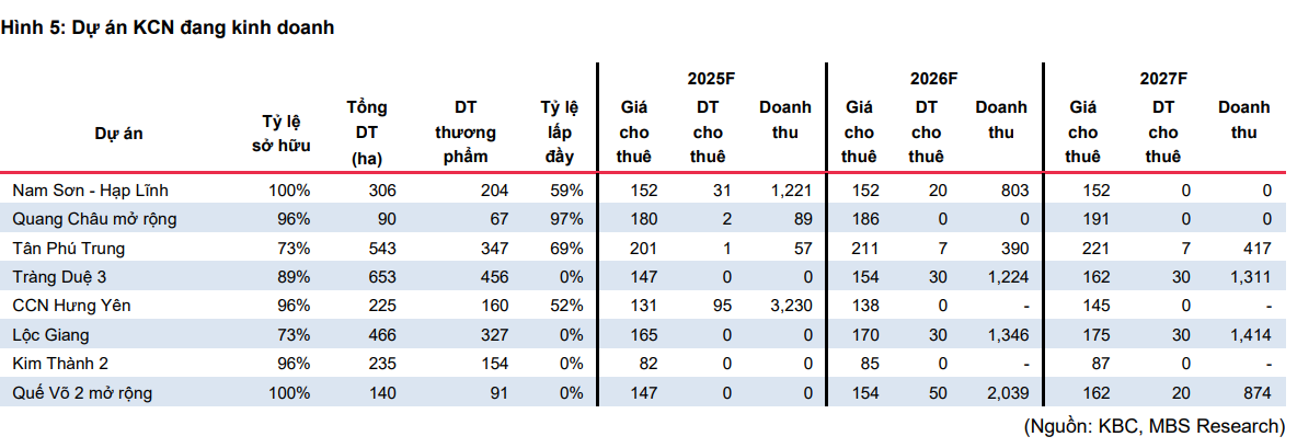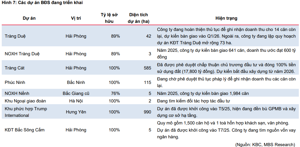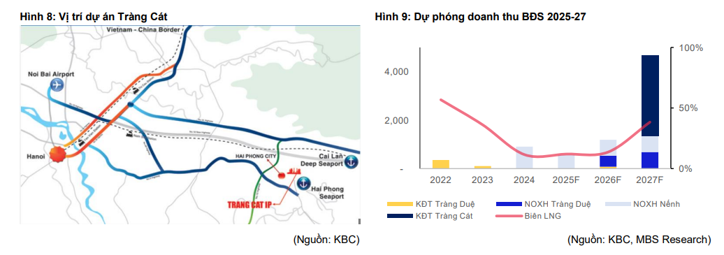 Trong quý 3 năm 2025, KBC dự kiến bàn giao 30 héc-ta đất tại KCN Nam Sơn – Hạp Lĩnh cho Goertek. Doanh thu cho thuê đất khu công nghiệp theo đó tăng 134% so với cùng kỳ, với biên lợi nhuận gộp đạt 50%. Doanh thu BĐS chủ yếu đến từ dự án nhà ở xã hội Nếnh và Tràng Duệ (+27% YoY), nhưng biên lợi nhuận chỉ khoảng 10-12%. MBS dự kiến lợi nhuận ròng quý 3 đạt 383 tỷ đồng (+95% YoY).