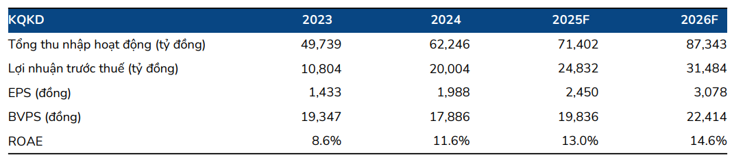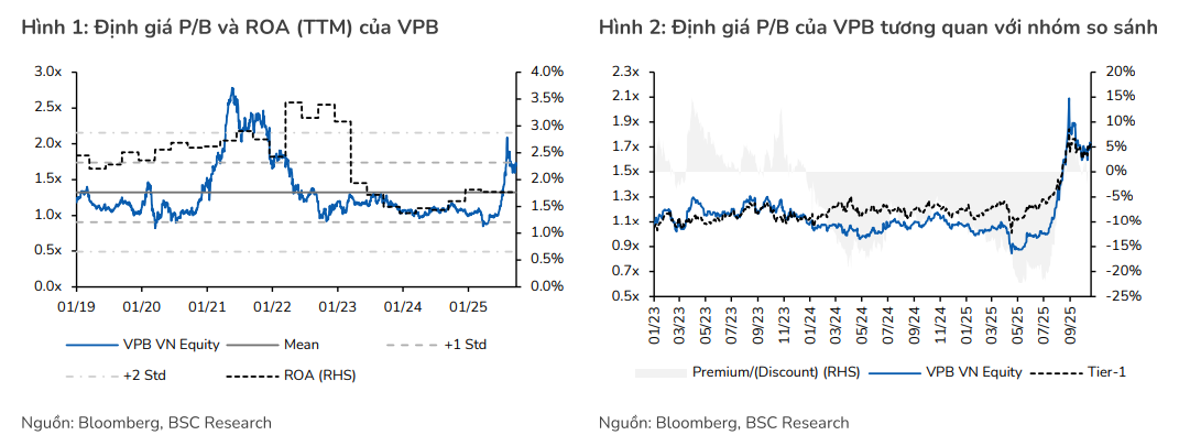 VPB tiếp tục thể hiện chiến lược tăng trưởng quy mô vượt trội. ROAE (TTM) liên tục cải thiện và đạt 14.6% tại cuối Quý 3/2025. BSC kỳ vọng KQKD cả năm 2025 sẽ vượt kế hoạch 25.3 nghìn tỷ đồng đề ra, đánh dấu một sự thay đổi đáng kể sau 4 năm liền không hoàn thành kế hoạch.