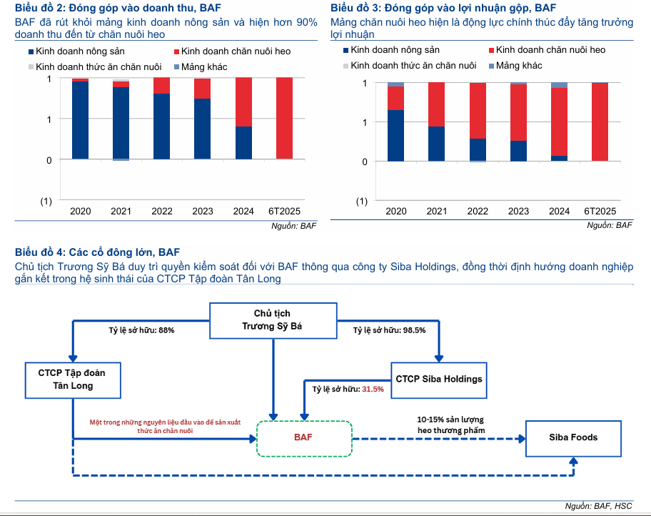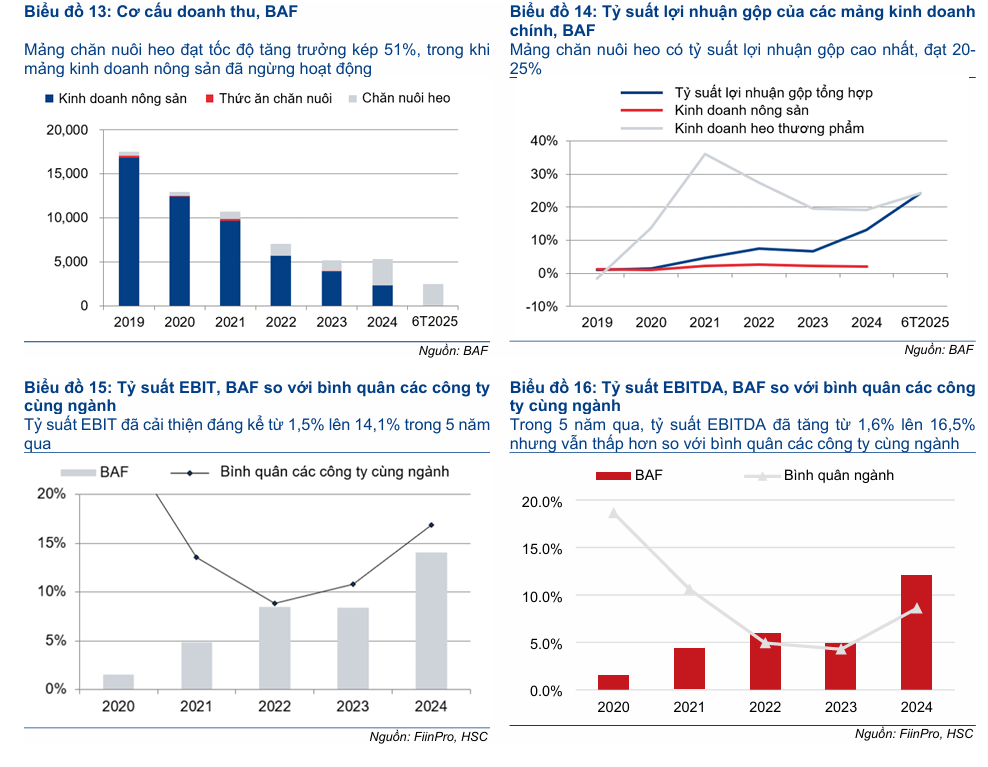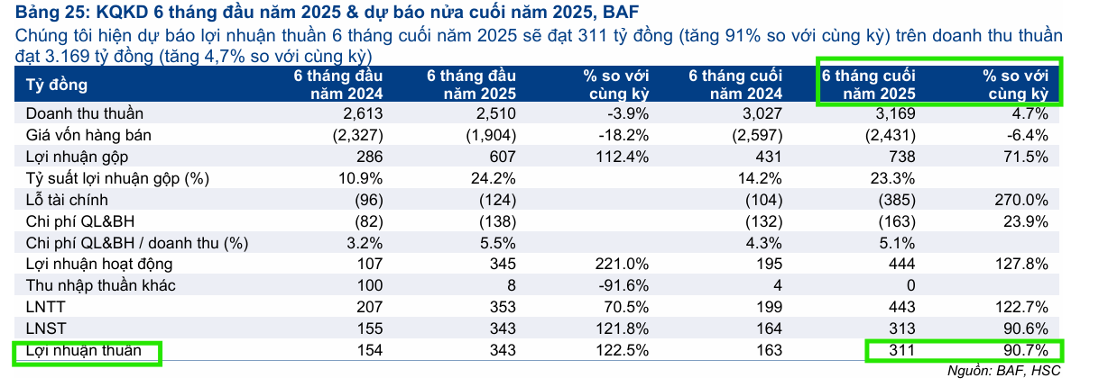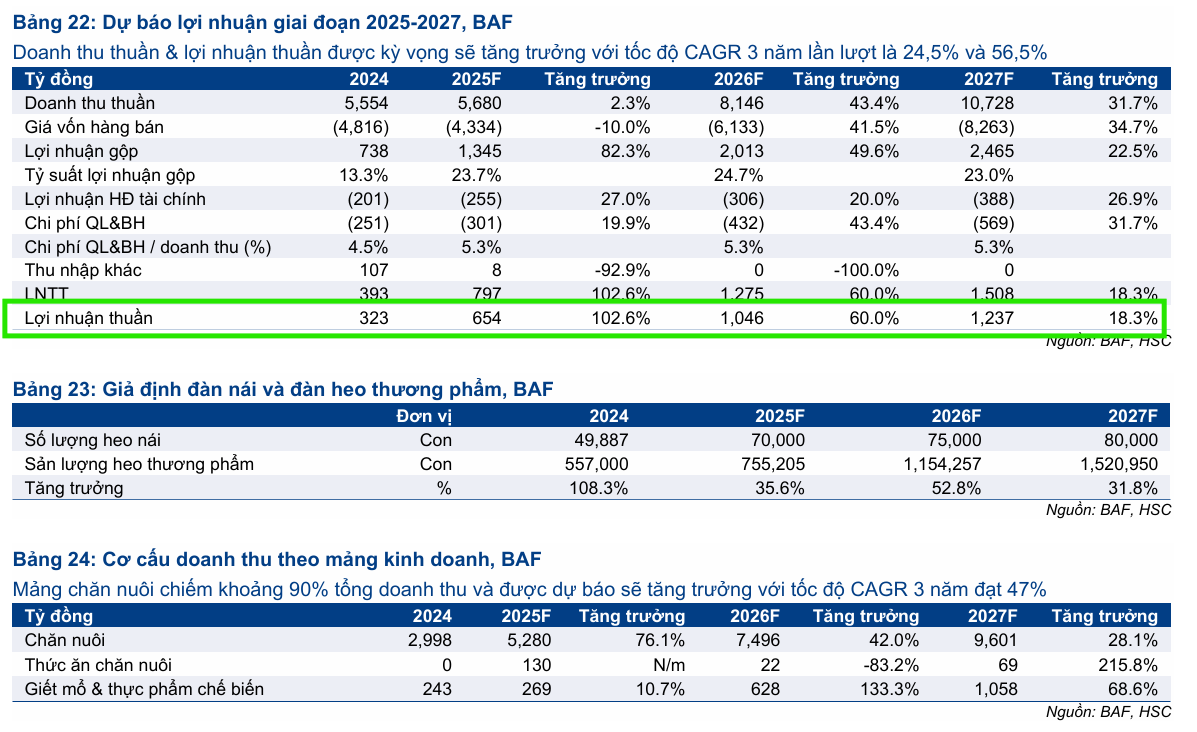 Trong năm 2025, HSC ước tính doanh thu thuần của BAF đạt 5,680 tỷ đồng (tăng trưởng 2.3%) và lợi nhuận thuần đạt 654 tỷ đồng (tăng trưởng mạnh 103%), hoàn thành vượt mức kế hoạch kinh doanh mà ban lãnh đạo Công ty đề ra. Mặc dù chi phí tài chính có thể tăng do giai đoạn đầu tư mở rộng trang trại, đà tăng trưởng mạnh mẽ của lợi nhuận gộp vẫn là nhân tố chủ chốt đảm bảo cho tăng trưởng lợi nhuận thuần vượt trội.