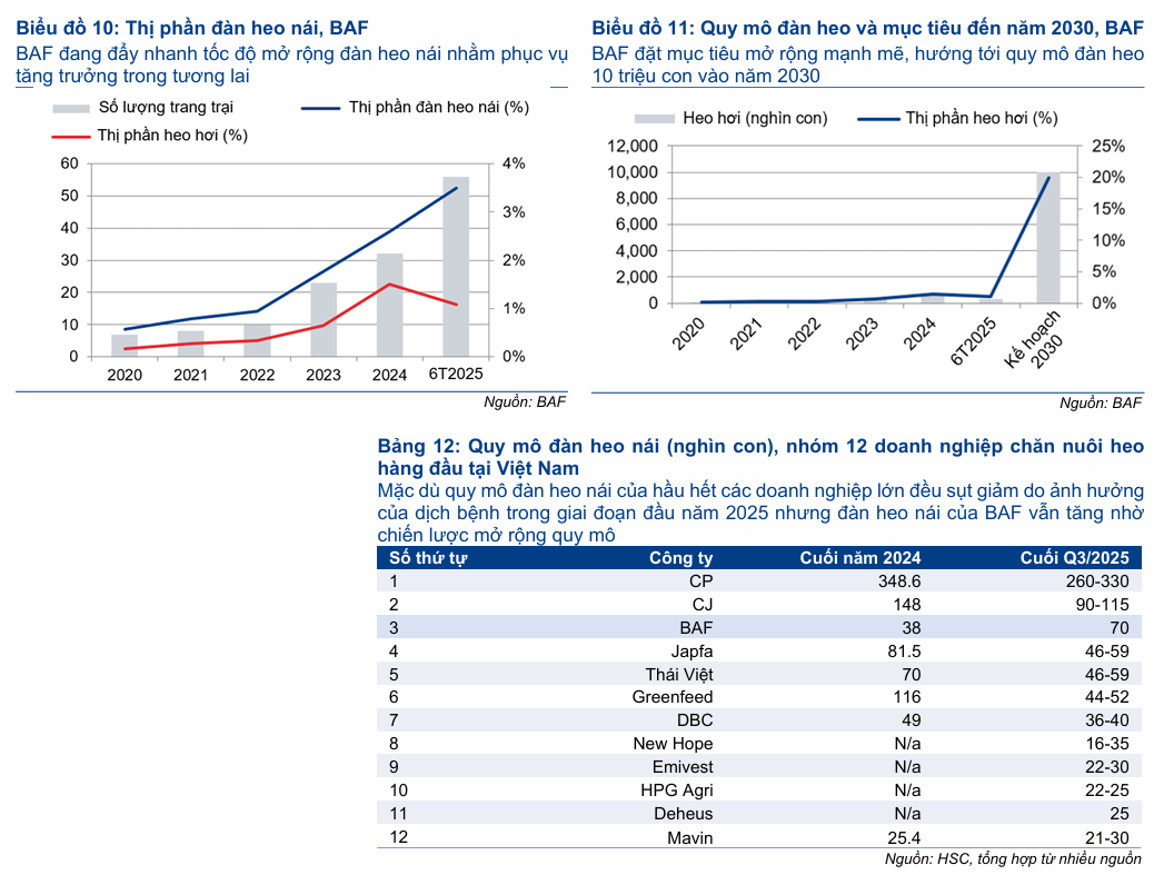 Sự chuyển đổi này không chỉ dừng lại ở quy mô mà còn nằm ở mô hình kinh doanh. BAF đã rút khỏi mảng kinh doanh nông sản có tỷ suất lợi nhuận dưới 3% và tập trung hoàn toàn vào mô hình 3F khép kín, kiểm soát chặt chẽ chuỗi cung ứng từ thức ăn chăn nuôi (hai nhà máy với tổng công suất 460,000 tấn/năm), đến trang trại (56 trang trại vận hành với công nghệ an toàn sinh học tiên tiến) và chế biến thực phẩm (cơ sở giết mổ và chế biến thịt). Là người gia nhập thị trường muộn, BAF có lợi thế trong việc đầu tư cơ sở vật chất hiện đại, giúp nâng cao hiệu quả hoạt động và giảm thiểu rủi ro dịch bệnh, đặc biệt quan trọng trong bối cảnh ngành chăn nuôi Việt Nam luôn đối mặt với rủi ro dịch bệnh.