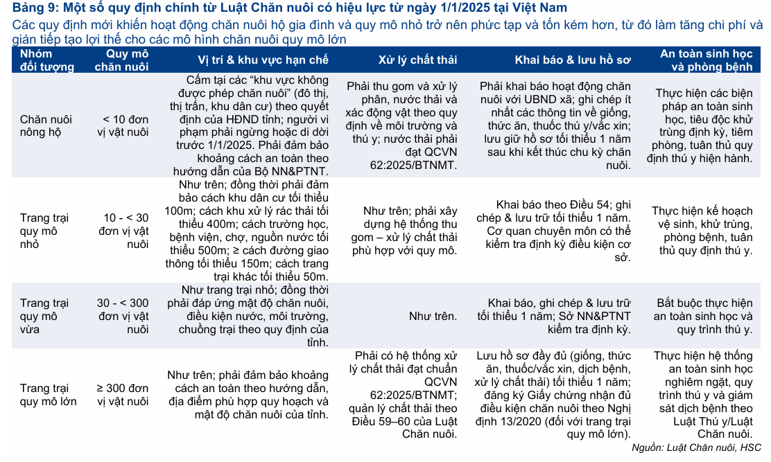 Thị trường thịt heo Việt Nam đang bước vào giai đoạn tập trung hóa mạnh mẽ. Xu hướng này được thúc đẩy bởi việc thực thi toàn diện Luật Chăn nuôi 2018 từ tháng 1/2025, quy định các tiêu chuẩn nghiêm ngặt hơn về môi trường và an toàn sinh học. Điều này buộc hàng nghìn hộ chăn nuôi nhỏ lẻ phải ngừng hoạt động hoặc di dời, tạo cơ hội cho các doanh nghiệp quy mô lớn, tuân thủ cao như BAF mở rộng thị phần. BAF với cơ sở vật chất hiện đại, công nghệ an toàn sinh học tiên tiến và khả năng tiếp cận vốn tốt, có vị thế độc nhất để hưởng lợi từ quá trình hợp nhất ngành này.