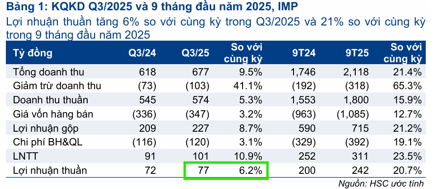 Tính chung 9 tháng đầu năm 2025, IMP đã đạt 1,800 tỷ đồng doanh thu thuần, tăng 16% so với cùng kỳ, và lợi nhuận thuần đạt 242 tỷ đồng, tăng 21% so với cùng kỳ. Kết quả này rất sát với dự báo của HSC.