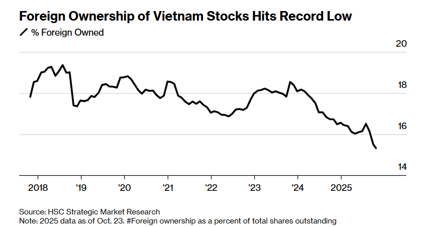 Kết quả là, theo HSC Strategic Market Research, tỷ lệ sở hữu nước ngoài trên tổng số cổ phiếu lưu hành đã giảm xuống mức thấp kỷ lục 15.3% trong tháng này. Chi phí phòng ngừa rủi ro (hedging costs) gia tăng, sau khi đồng Việt Nam Đồng giảm hơn 3% so với đồng Đô la Mỹ trong năm nay, đã làm trầm trọng thêm áp lực bán ra.
