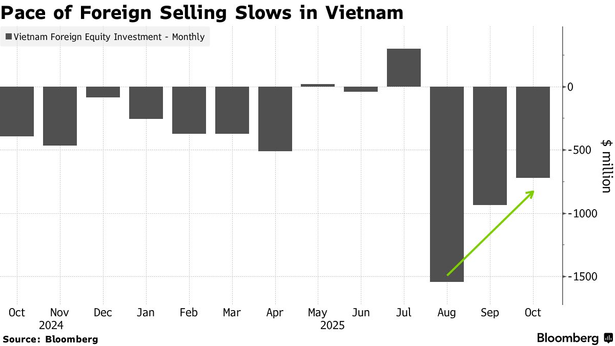 Sự giảm bớt đà bán này, cùng với sự hồi phục của đồng nội tệ (đang trên đà có tháng tốt nhất kể từ tháng Giêng), có thể tạo thêm động lực cho một trong những thị trường chứng khoán sôi động nhất châu Á trong năm nay. Cổ phiếu trong nước đã tăng giá trong năm 2025 nhờ sự lạc quan về tăng trưởng kinh tế mạnh mẽ, các cải cách thị trường vốn, và việc Việt Nam gần đây được nâng hạng lên thị trường mới nổi, điều này có thể thu hút hàng tỷ USD vốn đổ vào vào năm tới.