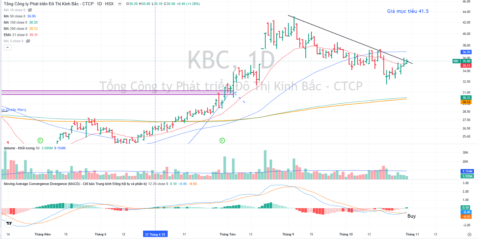 KBC hiện đang nằm dưới MA50 ngày để xây lại nền giá. Cổ phiếu sau khi tìm thấy hỗ trợ ở vùng giá 32,000 đang tìm cách breakout đường trendline kháng cự để tạo điểm mua sớm.