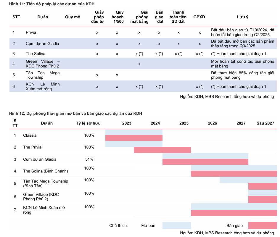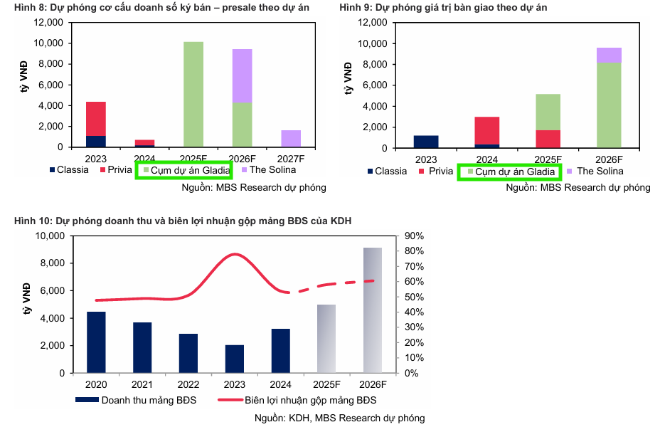 MBS kỳ vọng các giai đoạn tiếp theo của Gladia cũng sẽ duy trì tỷ lệ hấp thụ và mức giá bán tốt, qua đó giúp KDH ghi nhận lợi nhuận tích cực trong giai đoạn 2025-2026 và là nền tảng để tiếp tục triển khai các dự án khác như Bình Trưng – Bình Trưng Đông, Tân Tạo hay Phong Phú 2 (Green Village). MBS kỳ vọng lợi nhuận ròng của KDH sẽ tăng trưởng lần lượt 32% – 56% so với cùng kỳ trong giai đoạn này.