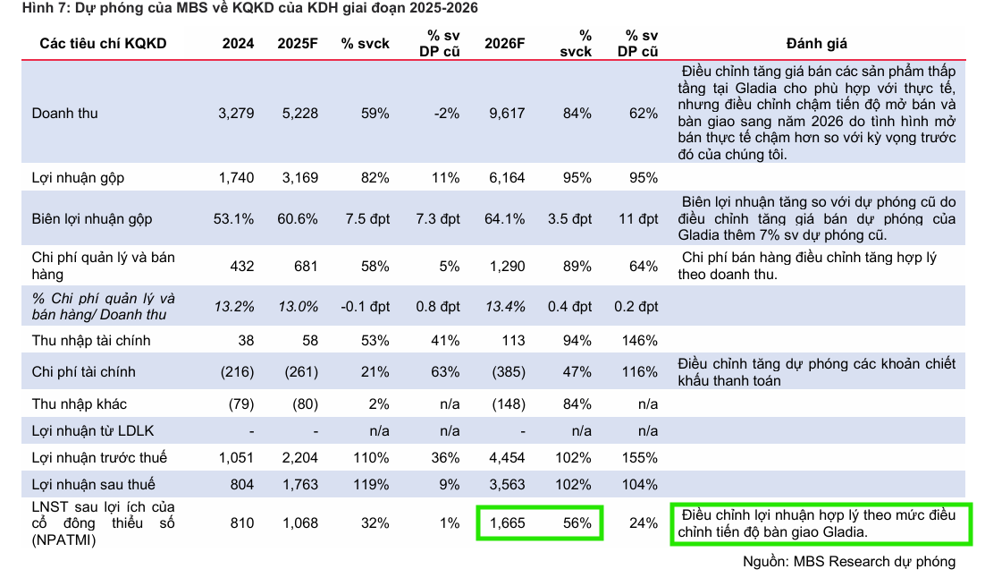 Cụm dự án Gladia được MBS nhận định là động lực tăng trưởng chính cho giai đoạn 2025-2026. Trong Quý 3/2025, các sản phẩm thấp tầng giai đoạn 1 của Gladia đã được mở bán và bàn giao, ghi nhận tín hiệu tích cực về khả năng hấp thụ và giá bán. Thậm chí, đợt mở bán đầu tiên (67 sản phẩm thấp tầng) đã đạt tỷ lệ hấp thụ 100%, với giá bán trung bình lên tới 250 triệu VNĐ/m2, cao hơn 13.6% so với dự báo của MBS.