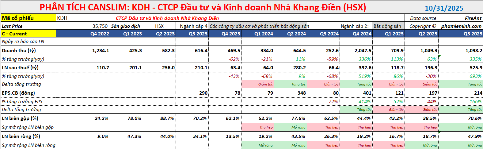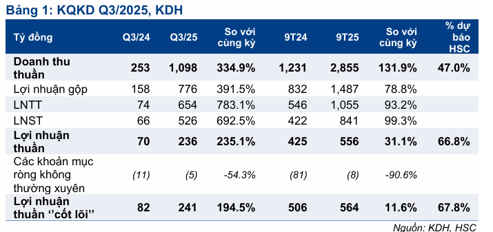 - LNST quý 3/2025 của KDH đạt 526 tỷ VNĐ (+693% YoY), LNST cổ đông công ty mẹ đạt 236 tỷ (+235%), nhờ ghi nhận doanh thu từ Gladia; lũy kế 9T2025 đạt 557 tỷ (+35.1%), hoàn thành 58.7% kế hoạch năm.