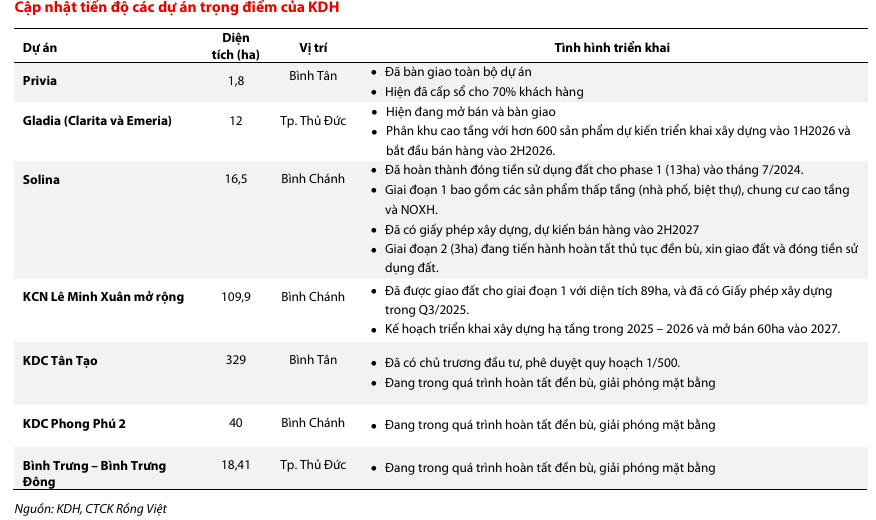 ACBS (3.11.2025) đưa ra giá mục tiêu 39,500 đồng với khuyến nghị Khả Quan, dựa trên kỳ vọng lợi nhuận sau thuế năm 2025 tăng trưởng 26% yoy, đạt 1,012 tỷ đồng và tăng +76% yoy vào năm 2026, đạt 1,782 tỷ đồng. ACBS cho biết dự án KDH đã nhận được Quyết định phê duyệt chủ trương đầu tư dự án Bình Trưng Đông mở rộng (18,4 ha nằm cạnh dự án Gladia) trong tháng 10. Do đó, ACBS điều chỉnh định giá dự án này tăng 30% lên 10.000 tỷ đồng để phản ánh tiến độ pháp lý của dự án và giá thịtrường tăng trong 3 tháng qua.
