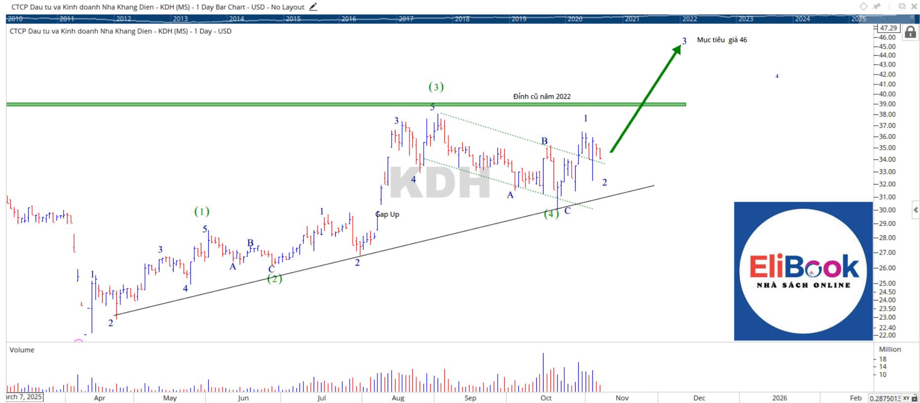 Dựa trên mô hình sóng Elliott, Elibook Team kỳ vọng KDH sẽ bứt phá lên vùng giá mục tiêu 46,000 đồng.