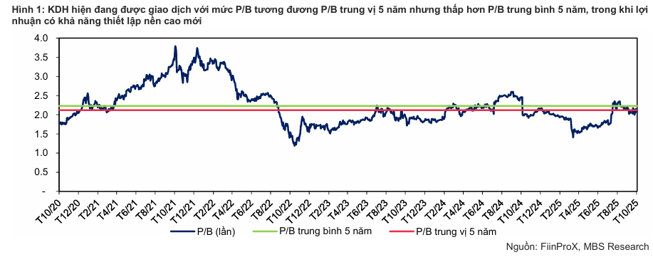 Hiện tại, KDH đang được giao dịch ở mức P/B dự phóng 2025 là 2.0x – thấp hơn so với P/B trung bình 5 năm (2.2x), cho thấy mức định giá hấp dẫn trong bối cảnh lợi nhuận dự kiến bứt phá.