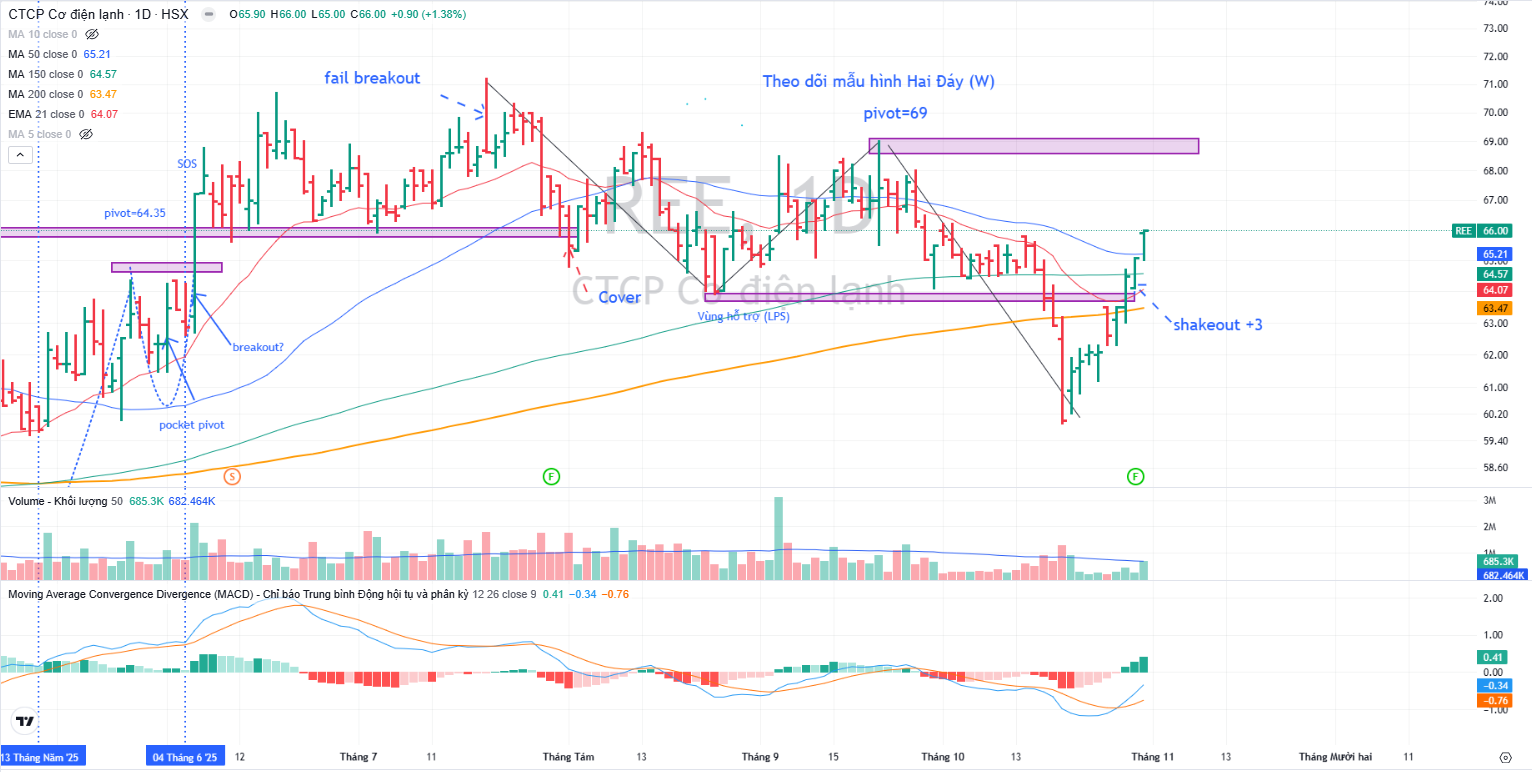 Các nhà giao dịch được khuyến nghị mua vào REE ở vùng giá 65-66,000 đồng theo điểm mua Shakeout +3, điểm mua sớm trong mẫu hình Hai Đáy (W), với điểm mua truyền thống là 69,000 đồng.