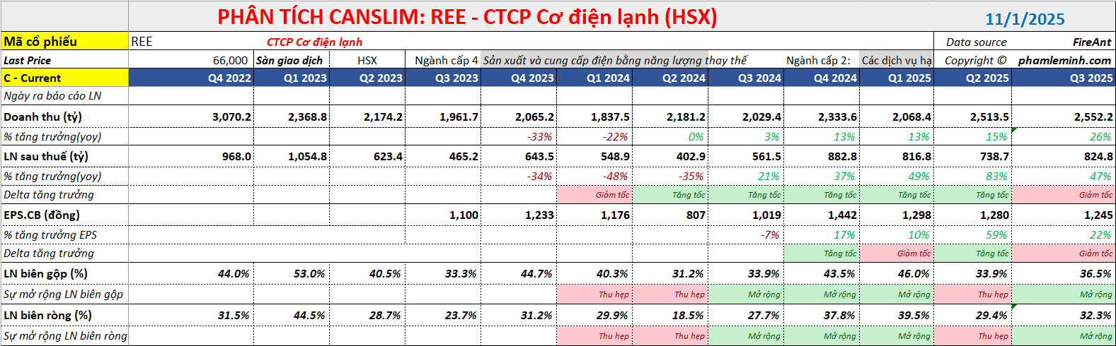 Quý 3/2025, REE ghi nhận doanh thu 2,552 tỷ đồng (+26% YoY) và lợi nhuận sau thuế đạt 824 tỷ đồng (+47% YoY). Đây là mức tăng trưởng cao nhất kể từ năm 2023, đánh dấu sự phục hồi rõ rệt của hoạt động năng lượng, trụ cột chính trong cơ cấu lợi nhuận của doanh nghiệp. Theo Vietcap, LNST sau lợi ích cổ đông thiểu số trong quý đạt 674 tỷ đồng (+40% YoY), vượt kỳ vọng so với các dự phóng trước đó.
