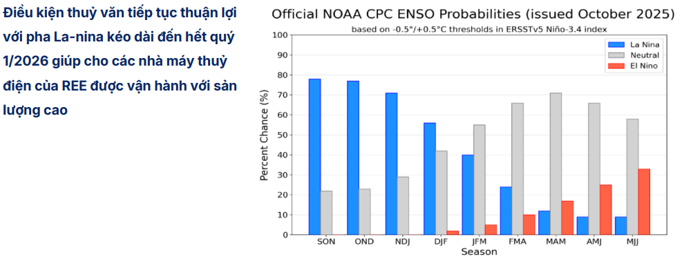 Động lực tăng trưởng chính của mảng thủy điện là điều kiện thủy văn thuận lợi kéo dài nhờ pha La-nina, giúp duy trì lưu lượng nước dồi dào đến hết quý 1/2026. Đồng thời, giá bán điện bình quân tăng do doanh nghiệp tham gia sâu hơn vào thị trường phát điện cạnh tranh. Ngoài ra, chi phí tài chính giảm đáng kể nhờ tái cấu trúc nợ vay cũng góp phần nâng biên lợi nhuận.