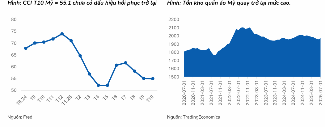 BSC bảo lưu quan điểm tăng trưởng kết quả kinh doanh Quý 4/2025 và 2026 của TNG sẽ có phần chậm lại. Sự chậm lại này xuất phát từ việc nhu cầu may mặc tại các thị trường xuất khẩu chưa có dấu hiệu hồi phục rõ rệt. Cụ thể, các nhãn hàng đã chuyển phần thuế tăng thêm sang cho người tiêu dùng, thể hiện qua chỉ số niềm tin tiêu dùng (CCI) Mỹ trong tháng 10 vẫn neo ở mức thấp (55.1) so với giai đoạn đầu năm (quanh mức 70), cho thấy người tiêu dùng có xu hướng tiết kiệm chi tiêu hơn. Đồng thời, mức tồn kho quần áo tại Mỹ quay trở lại mức cao, khiến động lực nhập hàng của các nhãn hàng không mạnh.