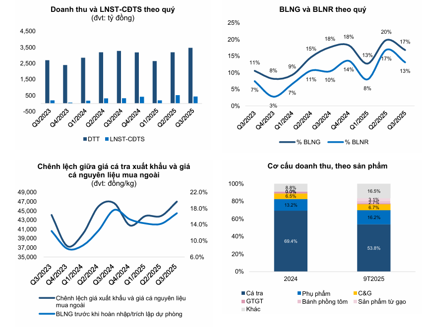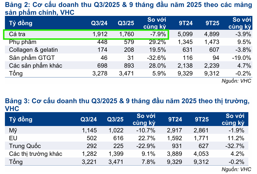 BSC cho biết, sự tăng trưởng về doanh thu đến từ sự hồi phục của doanh thu phụ phẩm, tăng 41% YoY, bù đắp cho sự sụt giảm của doanh thu cá tra xuất khẩu (Vietcap cho biết doanh thu mảng collagen & gelatin (C&G) quý 3 có mức tăng 20% YoY). Doanh thu cá tra xuất khẩu giảm 5% YoY do sản lượng xuất khẩu giảm mạnh 18.2% và giá xuất khẩu bình quân cũng giảm 1.3%. Nhu cầu tại thị trường Mỹ suy giảm dưới ảnh hưởng của thuế đối ứng là nguyên nhân chính dẫn đến tình trạng này.