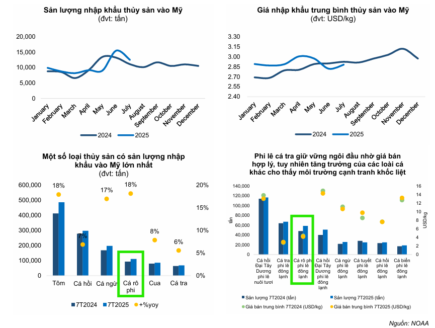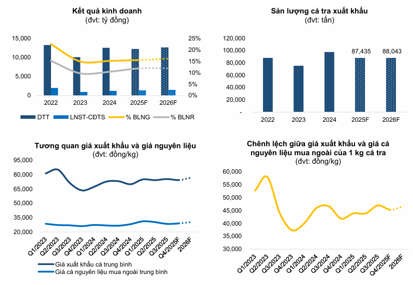 - Mảng cá tra – hoạt động cốt lõi – suy yếu rõ rệt, doanh thu giảm 7.9%, sản lượng tiêu thụ giảm 18.2%, giá bán bình quân giảm 1.7%; xuất khẩu sang Mỹ và Trung Quốc giảm mạnh, EU là điểm sáng (+22.7%).