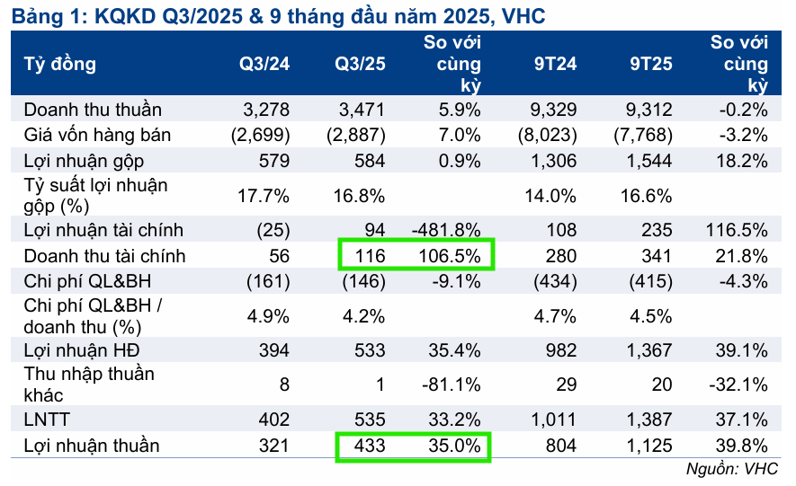 LNST quý 3/2025 của VHC đạt 433 tỷ đồng (+35% YoY), vượt 14% kỳ vọng, chủ yếu nhờ lợi nhuận tài chính tăng mạnh (đạt 94 tỷ đồng, đảo ngược khoản lỗ cùng kỳ), chi phí vận hành giảm 9.1%, biên lợi nhuận gộp cải thiện lên 16.6%.