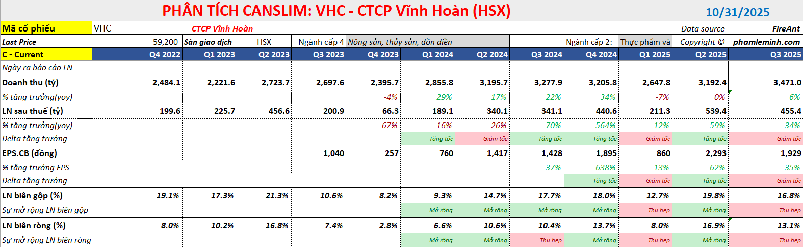 VHC ghi nhận mức tăng trưởng lợi nhuận ấn tượng trong quý 3/2025. VHC đạt lợi nhuận thuần 433 tỷ đồng, tăng 35% so với cùng kỳ, trên doanh thu thuần đạt khoảng 3,471 tỷ đồng, chỉ tăng nhẹ 5.6% so với cùng kỳ. Đáng chú ý, mức lợi nhuận thuần này cao hơn tới 14% so với kỳ vọng ban đầu của HSC, và cũng cao hơn kỳ vọng của BSC, cho thấy sự bất ngờ tích cực từ các yếu tố ngoài hoạt động kinh doanh chính.