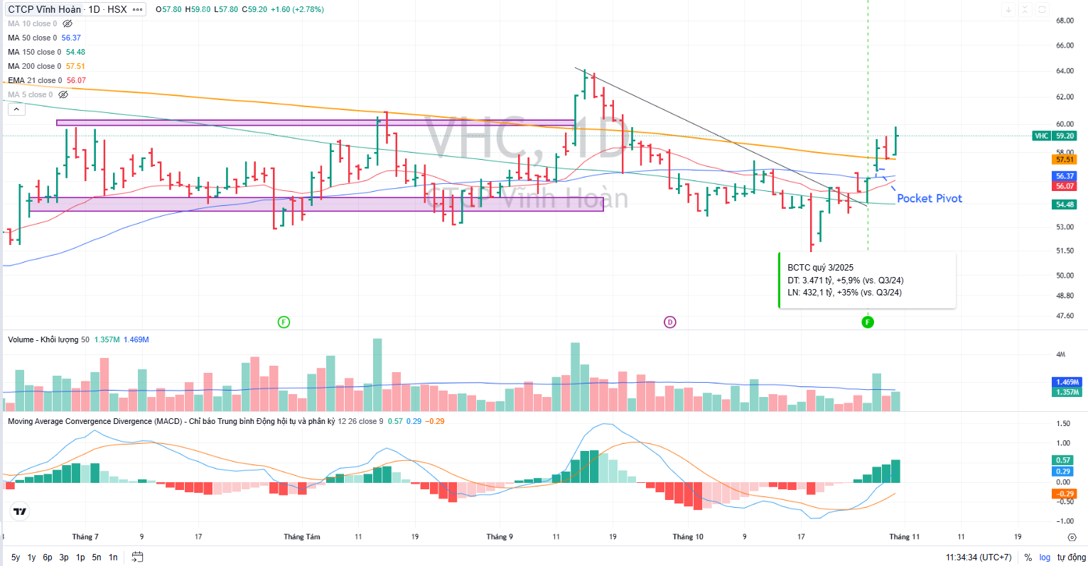 Trên đồ thị, RS của VHC đang cải thiện dần và ở mức 70 điểm, hoạt động khá tốt. Mặc dù VHC có điểm mua Pocket Pivot vào ngày 29.10.2025, sau khi Việt Nam và Mỹ có khung thỏa thuận thương mại, nhưng Elibook Team vẫn trung lập với nhóm ngành xuất khẩu.