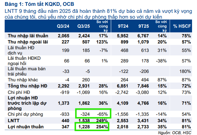 Cụ thể, HSC cho biết, LNTT của OCB vượt kỳ vọng nhờ doanh thu tăng trưởng vượt giả định (tăng 28% so với cùng kỳ), tỷ lệ NIM và thu nhập từ thu hồi nợ xấu cao hơn ước tính, cùng với chi phí dự phòng giảm tới 65% so với cùng kỳ. Lũy kế 9 tháng đầu năm 2025, LNTT của OCB đạt 3,400 tỷ đồng, tăng 34% so với cùng kỳ và hoàn thành 81% dự báo cả năm của HSC.