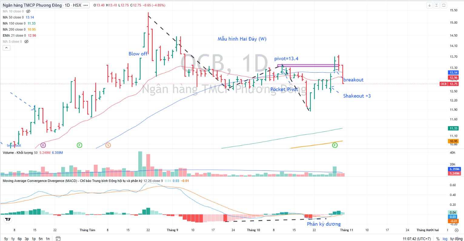 Trên đồ thị, RS của OCB là 77, nằm trong số các cổ phiếu hoạt động khá tốt trên thị trường. Ngày 29.10.2025, OCB breakout mẫu hình Hai Đáy (W) vượt qua điểm mua 13,400 đồng. Tuy nhiên, sự giảm giá sau đó của thị trường chung khiến OCB giảm xuống dưới điểm mua. Nhà đầu tư nên quan sát khả năng giành lại điểm mua 13,400 đồng để mở vị thế.