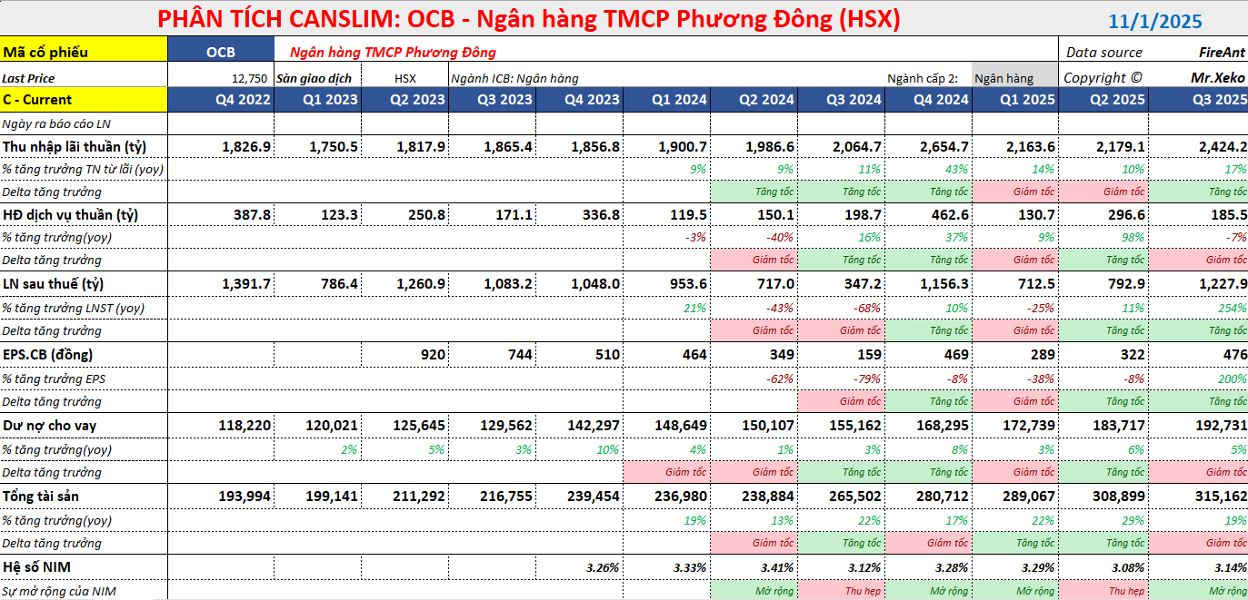 Về hoạt động kinh doanh cốt lõi, tăng trưởng tín dụng của OCB đạt 12.5% kể từ đầu năm (tăng 4% so với quý trước), vẫn thấp hơn một chút so với mức bình quân 13.4% của toàn hệ thống tính đến cuối tháng 9. Phân khúc khách hàng doanh nghiệp được dự đoán tiếp tục là động lực tăng trưởng chính. Đối với nguồn vốn, tổng vốn huy động (tiền gửi và giấy tờ có giá) tăng 14.7% so với đầu năm. Hệ số LDR điều chỉnh theo đó tăng lên 95% từ 93% trong quý 2/2025.