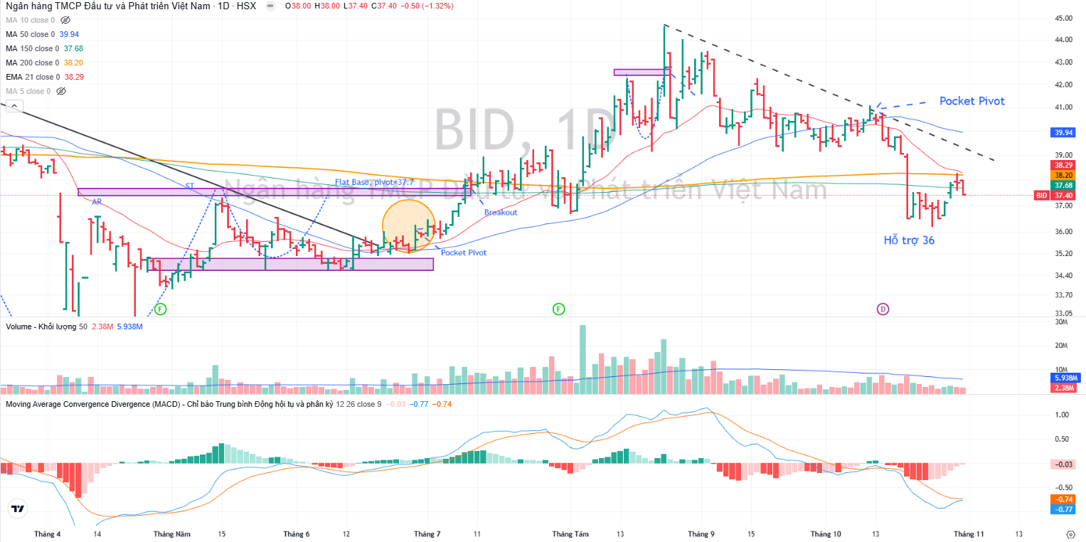 BID đang có hỗ trợ ở vùng giá 36,000, tạo bởi Fibonacci 61.8% của đợt tăng giá từ tháng 4 đến tháng 8. Khả năng BID đang cố gắng tích lũy lại quanh MA200 ngày.