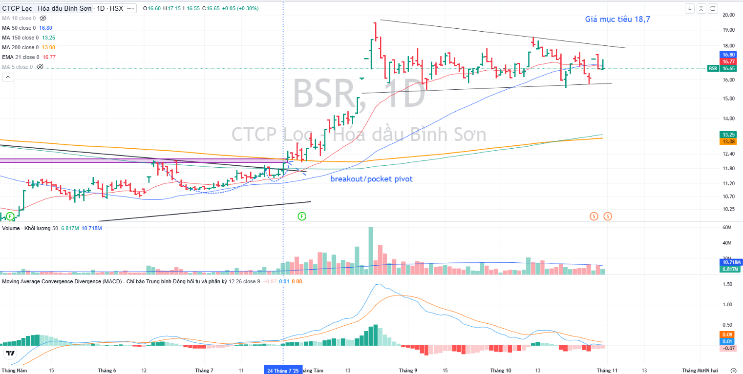 Trên đồ thị, BSR có RS =90, hoạt động tốt trên thị trường. BSR đang hoạt động tốt nhất trong nhóm cổ phiếu năng lượng. Mặc dù hiện tại BSR gặp phải áp lực chốt lời từ đội tự doanh của VIX và cả sự điều chỉnh của thị trường chung, nhưng cổ phiếu vẫn đang tích lũy quanh MA50 ngày để xây lại nền giá. Các nhà giao dịch chờ đợi điểm cổ phiếu nén lại chặt chẽ hơn trước khi tham gia. Hỗ trợ ngắn hạn cho BSR là 16,000 đồng.