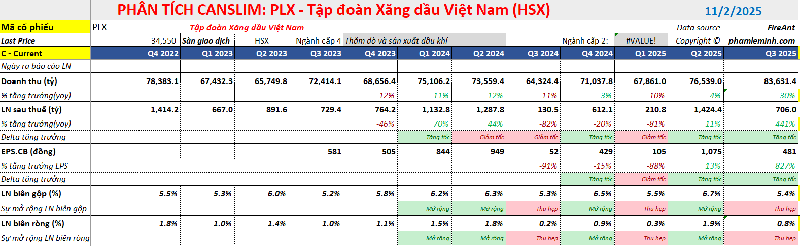 - Cải thiện biên lợi nhuận: Sự ổn định tương đối của giá dầu trong quý 3/2025, với mức biến động chỉ khoảng 8 USD/thùng (so với 18 USD/thùng trong quý 3/2024), đã giúp giảm bớt áp lực lên hàng tồn kho của PLX, dù giá dầu Brent vẫn giảm 14% YoY.