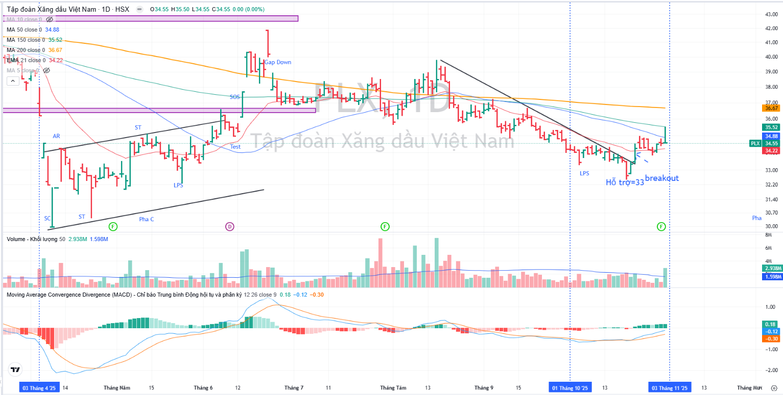 Trên đồ thị, RS của PLX là 30, hoạt động khá kém trên thị trường. PLX hiện đang breakout đường trendline tạo điểm mua sớm. Mặc dù không khuyến nghị MUA đối với PLX, nhưng Elibook Team cho rằng, cổ phiếu này có khả năng đã tạo đáy ở vùng hỗ trợ 33,000 đồng và kỳ vọng tăng giá trong thời gian tới, vượt MA200 ngày.