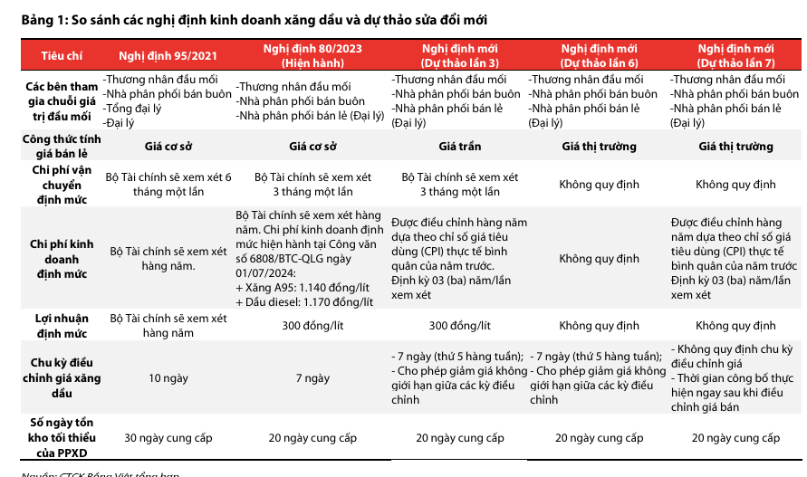 Dự thảo 7 đưa ra cơ chế tính toán giá bán lẻ kém linh hoạt hơn so với Dự thảo 6. VDSC cho rằng ngành xăng dầu Việt Nam đang bước vào giai đoạn tái cấu trúc sâu, với trọng tâm là chuyển đổi cơ chế điều hành giá sang hướng thị trường có kiểm soát. Từ Dự thảo lần 3 đến Dự thảo lần 7 của Nghị định Kinh doanh xăng dầu, Nhà nước đã mở rộng quyền tự chủ giá cho doanh nghiệp, chuẩn hóa chi phí và siết chặt điều kiện đầu mối, hướng đến một thị trường minh bạch, cạnh tranh và hiệu quả hơn.