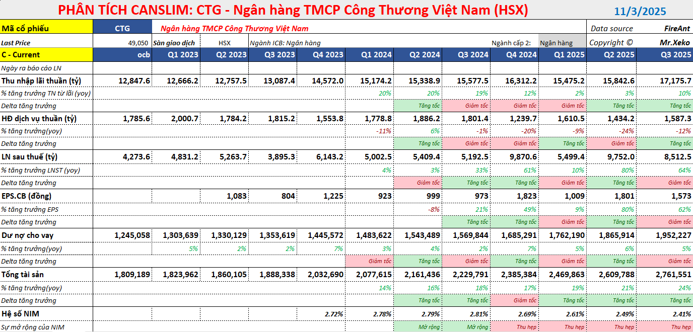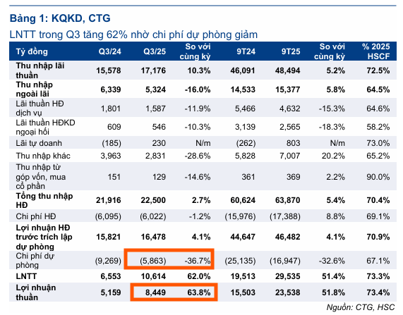 LNTT quý 3/2025 đạt 10,600 tỷ đồng (+62% YoY), lũy kế 9T đạt 29,500 tỷ đồng (+51.4%), nhờ chi phí dự phòng giảm mạnh (-32.6% YoY), giúp CTG vượt 78% kế hoạch năm; tăng trưởng tín dụng đạt 15.6%, cao hơn toàn ngành.