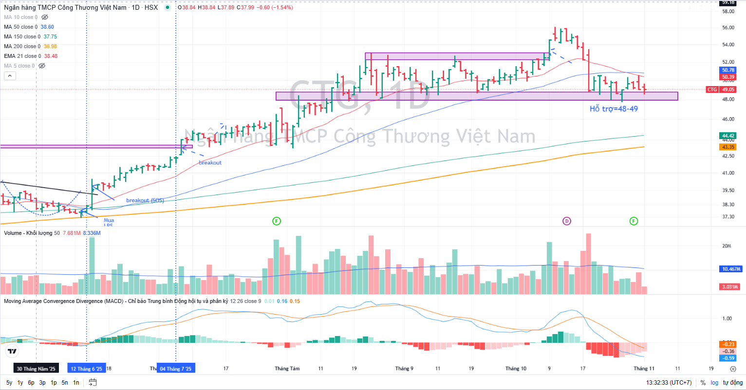 Trên đồ thị, RS của CTG là 78, hoạt động ở mức khá tốt trên thị trường. CTG là leader ngành ngân hàng với chất xúc tác từ việc tăng vốn, Cụ thể, ngân hàng sẽ phát hành gần 2.4 tỷ cổ phiếu để trả cổ tức bằng cổ phiếu, tương ứng tỷ lệ phát hành là 44.63%. Sau khi phát hành, vốn điều lệ VietinBank sẽ tăng từ 53,700 tỷ đồng lên 77,669 tỷ đồng. Thời gian phát hành dự kiến trong Quý IV/2025 – Quý I/2026.