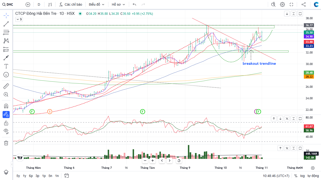 Trên đồ thị kỹ thuật, DHC có RS=93, mức hoạt động tốt trên thị trường. DHC hiện đang xây tay cầm trong mẫu hình Giant Cup, khả năng sẽ có điểm breakout nền giá nhờ kết quả kinh doanh tích cực. Lưu ý, câu chuyện của DHC sẽ tập trung vào viết tăng trưởng lợi nhuận, về câu chuyện khởi công dự án Giao Long 3, câu chuyện này đã liên tục bàn lùi qua các năm, nên chúng ta chỉ tập trung vào tăng trưởng của doanh nghiệp, khi đơn hàng frontloading vẫn duy trì đà tăng.