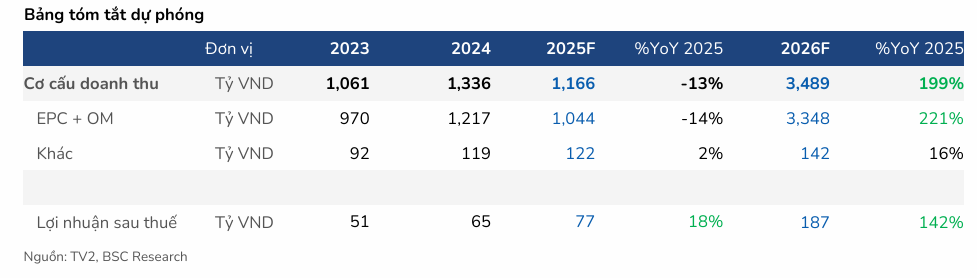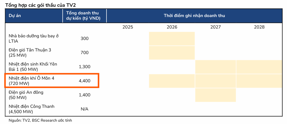 Theo BSC, trong kỳ, công ty thiếu dự án để ghi nhận, doanh thu chủ yếu đến từ hoạt động O&M. Từ Q4/2025, công ty thực hiện dự án lớn nhà máy nhiệt điện Ô Môn 4 và có thể bắt đầu ghi nhận doanh thu từ Q4/2026 (giá trị công việc của TV2 ước tính đạt 4,400 tỷ VND -cao gấp 4 lần doanh thu trung bình giai đoạn 2023 – 2025).