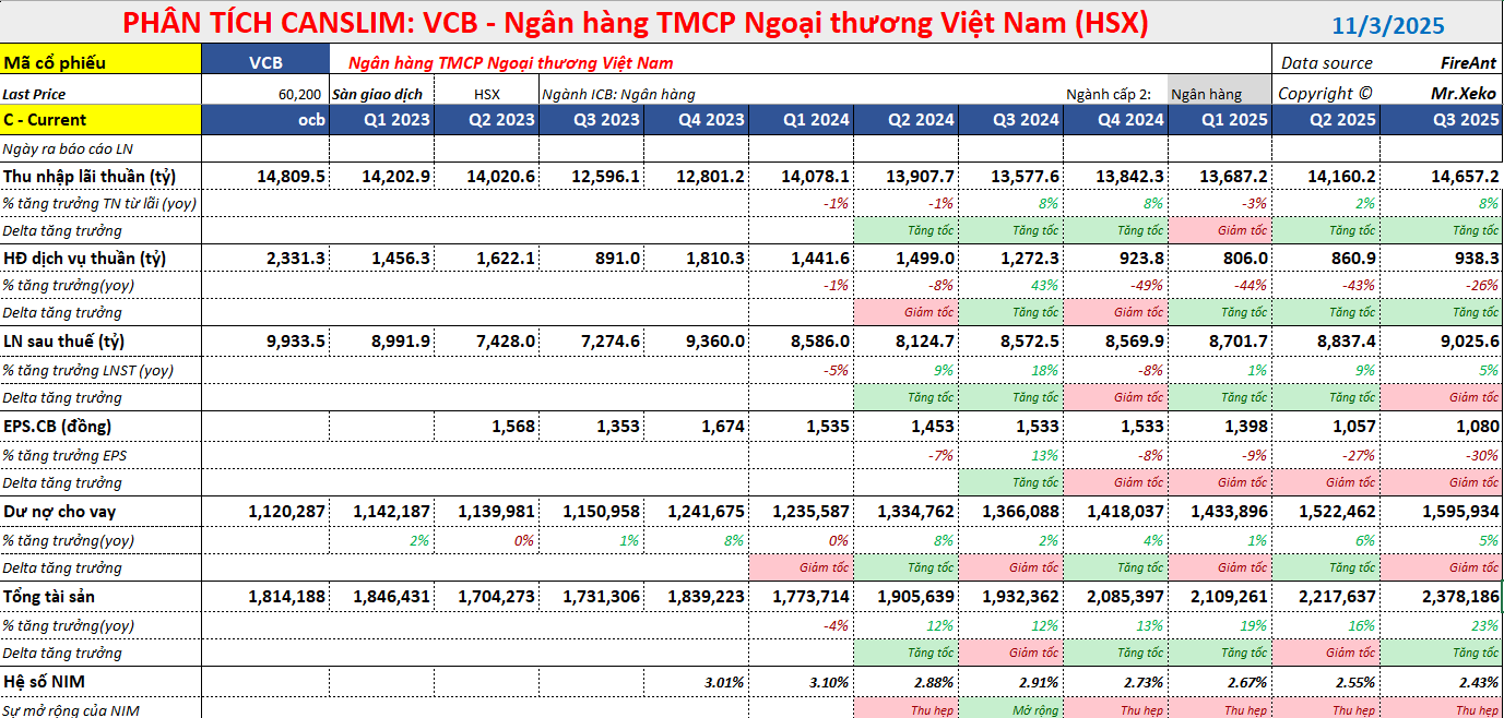 Riêng quý 3/2025, LNTT của VCB đạt 11,200 tỷ đồng (+1.9% QoQ, +5.0% YoY). Nhìn chung, kết quả lợi nhuận của ngân hàng được đánh giá là thấp hơn nhẹ so với kỳ vọng của Vietcap do Biên lãi ròng (NIM) không đạt như dự báo, từ đó Vietcap nhận thấy rủi ro điều chỉnh giảm nhẹ đối với dự báo lợi nhuận hiện tại.