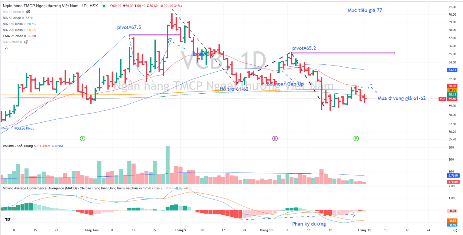 Trên đồ thị, RS của VCB là 36, hoạt động yếu trên thị trường. Đã có dấu hiệu tạo đáy khi giá phân kỳ dương với MACD Histogram. Tuy nhiên, để mở điểm mua, giá cần vượt vùng 61-62,000 để tạo ra điểm mua Shakeout +3, điểm mua sớm trong mô hình 2 đáy (W).