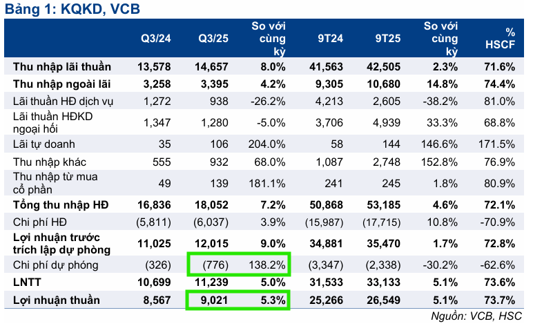 Trong khi đó, kết quả lợi nhuận quý 3 của VCB khớp với kỳ vọng của HSC.