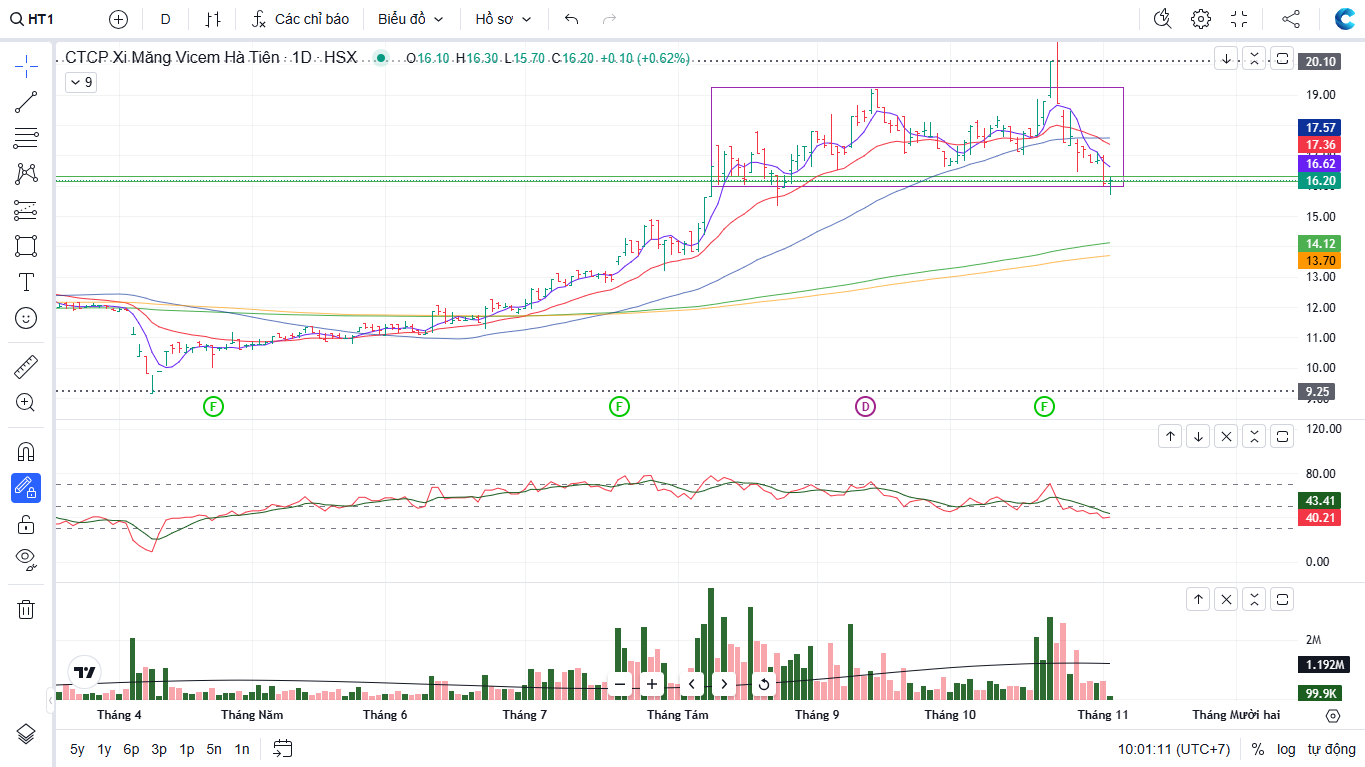 Trên biểu đồ kỹ thuật, HT1 đang có RS=80, mức hoạt động tốt trên thị trường. HT1 khả năng đang xây nền giá phẳng, và đang tìm về hỗ trợ cứng quanh giá 16,000 đồng. Elibook Team không khuyến nghị trading tại cổ phiếu HT1, nhóm đầu tư công Team ưu tiên đánh VCG và LCG, một ít ở CTD, tuy nhiên sau các nhịp điều chỉnh mạnh của thị trường, nhóm đầu tư công cần thời gian để tích lũy trước khi bật tăng trở lại