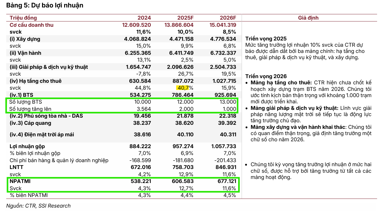 SSI dự báo lợi nhuận sau thuế của cổ đông công ty mẹ (NPATMI) của CTR sẽ duy trì đà tăng trưởng ổn định 12-13% trong giai đoạn 2025-2026, lần lượt đạt 606 tỷ và 677 tỷ đồng. Động lực tăng trưởng này sẽ đến từ việc tiếp tục mở rộng mạng lưới BTS (dự kiến tăng thêm 2,000 trạm năng 2025 và 1,000 trạm năm 2026) và sự đóng góp ngày càng lớn của mảng năng lượng mặt trời.